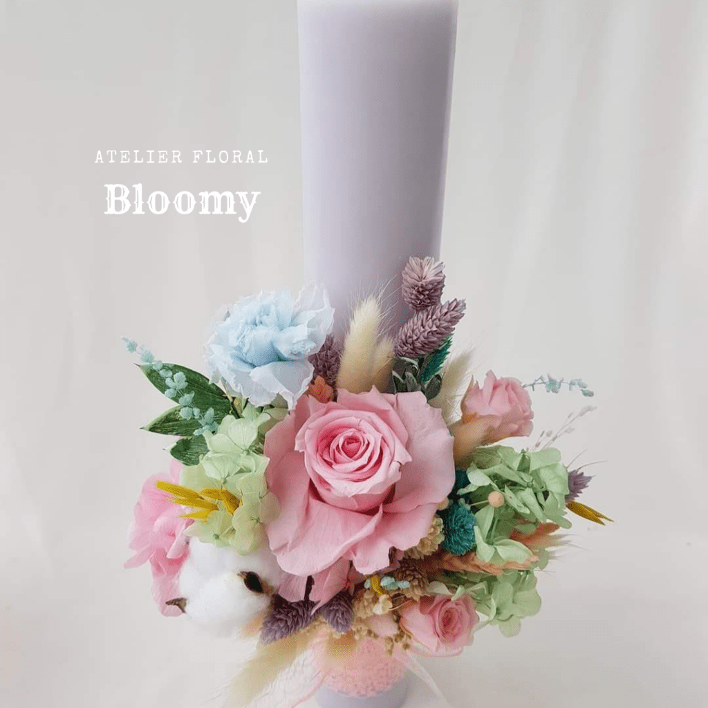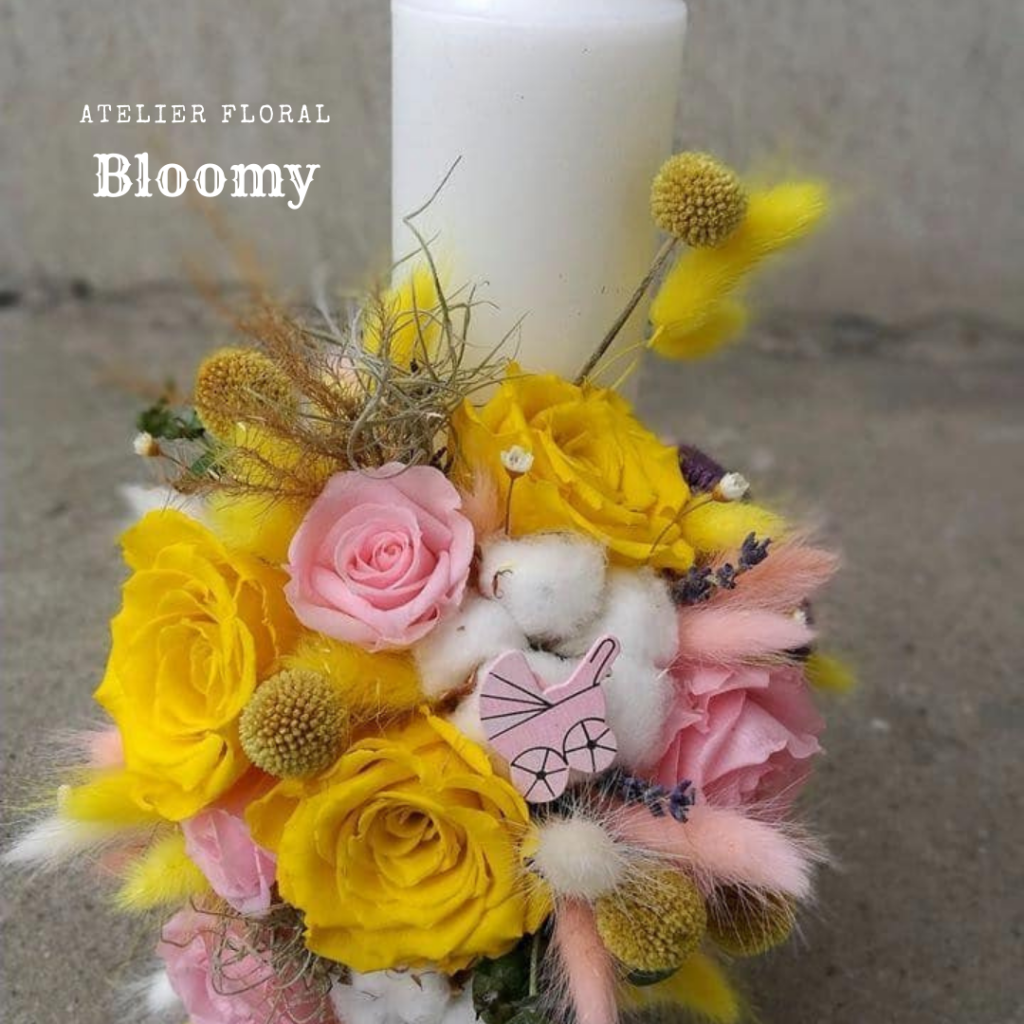 Lumânare cu un design deosebit și viu colorat din trandafiri criogenati yellow și pink, decorațiuni și flori stabilizate.