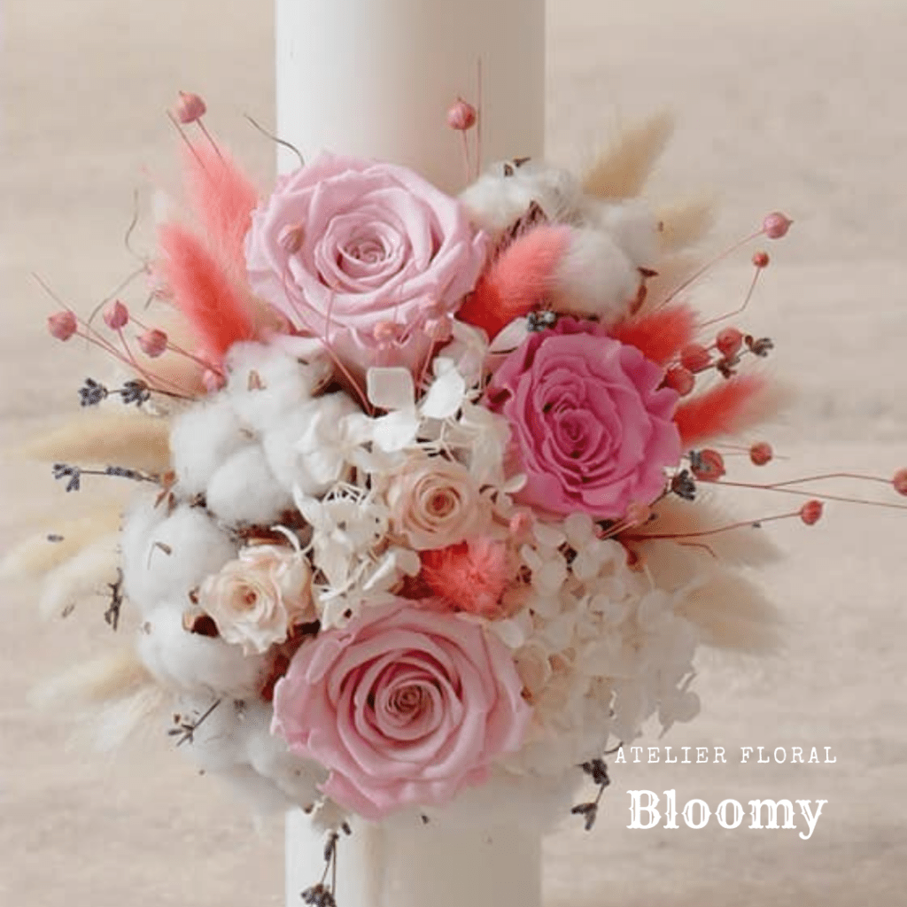 Lumânare deosebită cerată cu hortensie criogenata alb-roz, trandafiri criogenati pink și somon, bumbac și flori uscate.