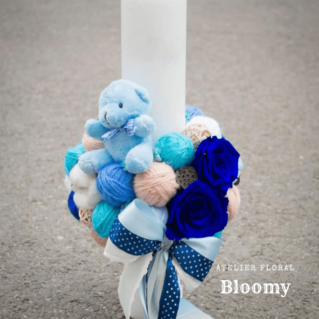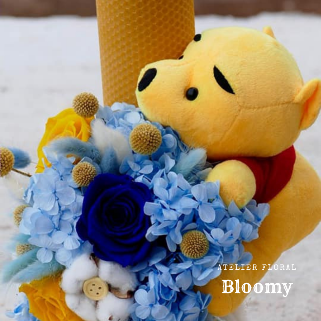 Trandafiri criogenati albastru si yellow, lumanare cerata, hortensie bleu, alte flori stabilizate, jucarie plus.