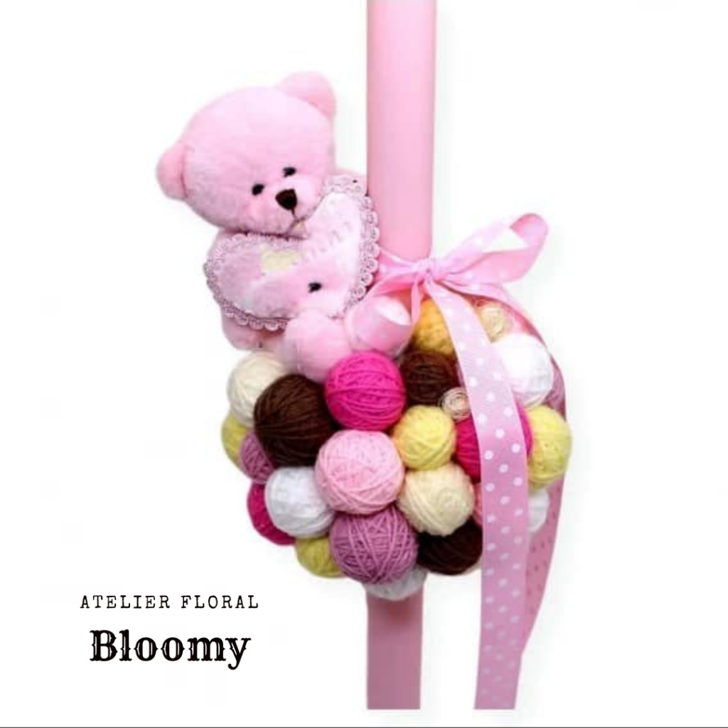 Lumânare realizată handmade din gheme colorate și jucărie de plus. Diametru aranjament 30 cm.