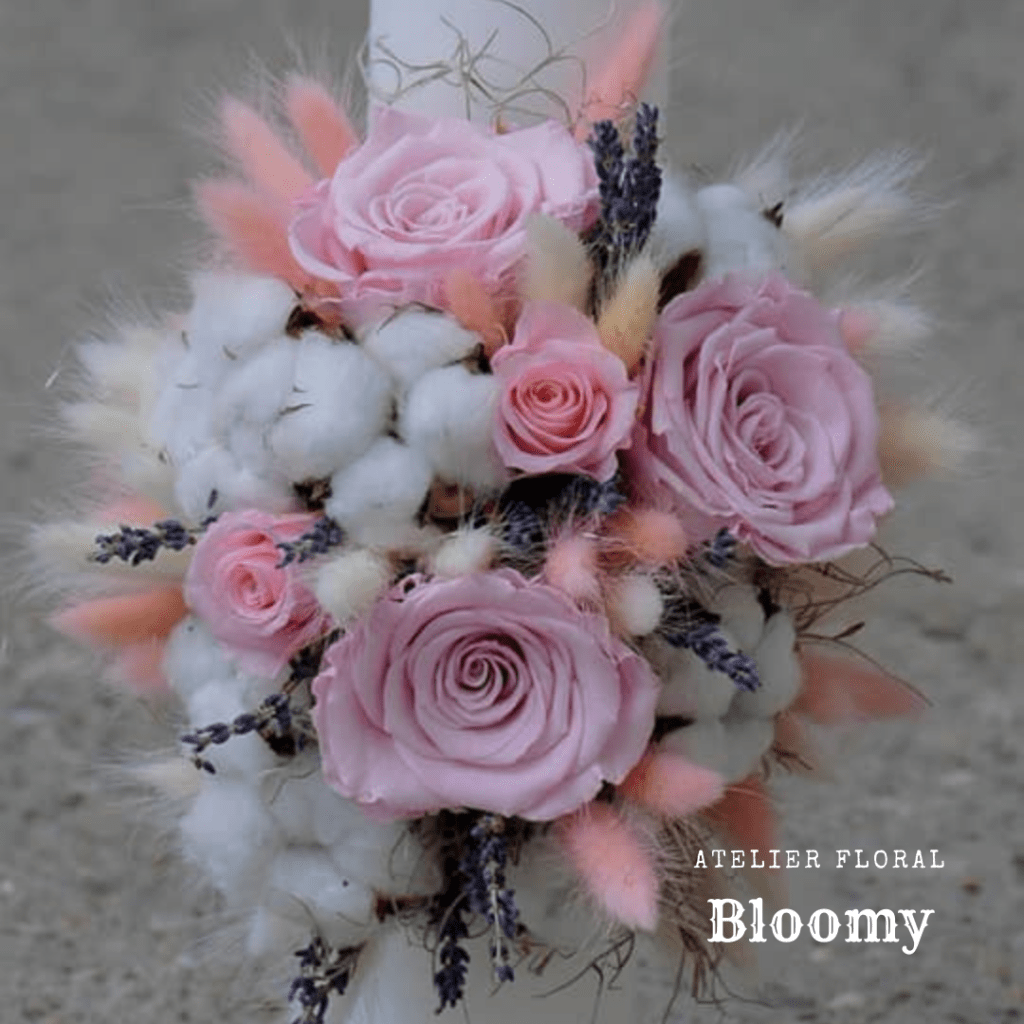 Trandafiri criogenati roz 2 nuanțe, hortensie criogenata albă, flori stabilizate/uscate pink, bumbac.