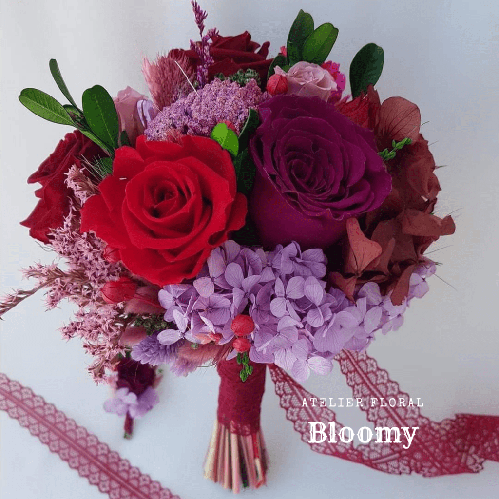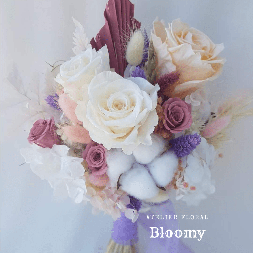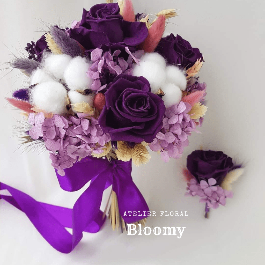 Trandafiri minirose lila criogenati, hortensie albastru, flori stabilizate, bumbac.