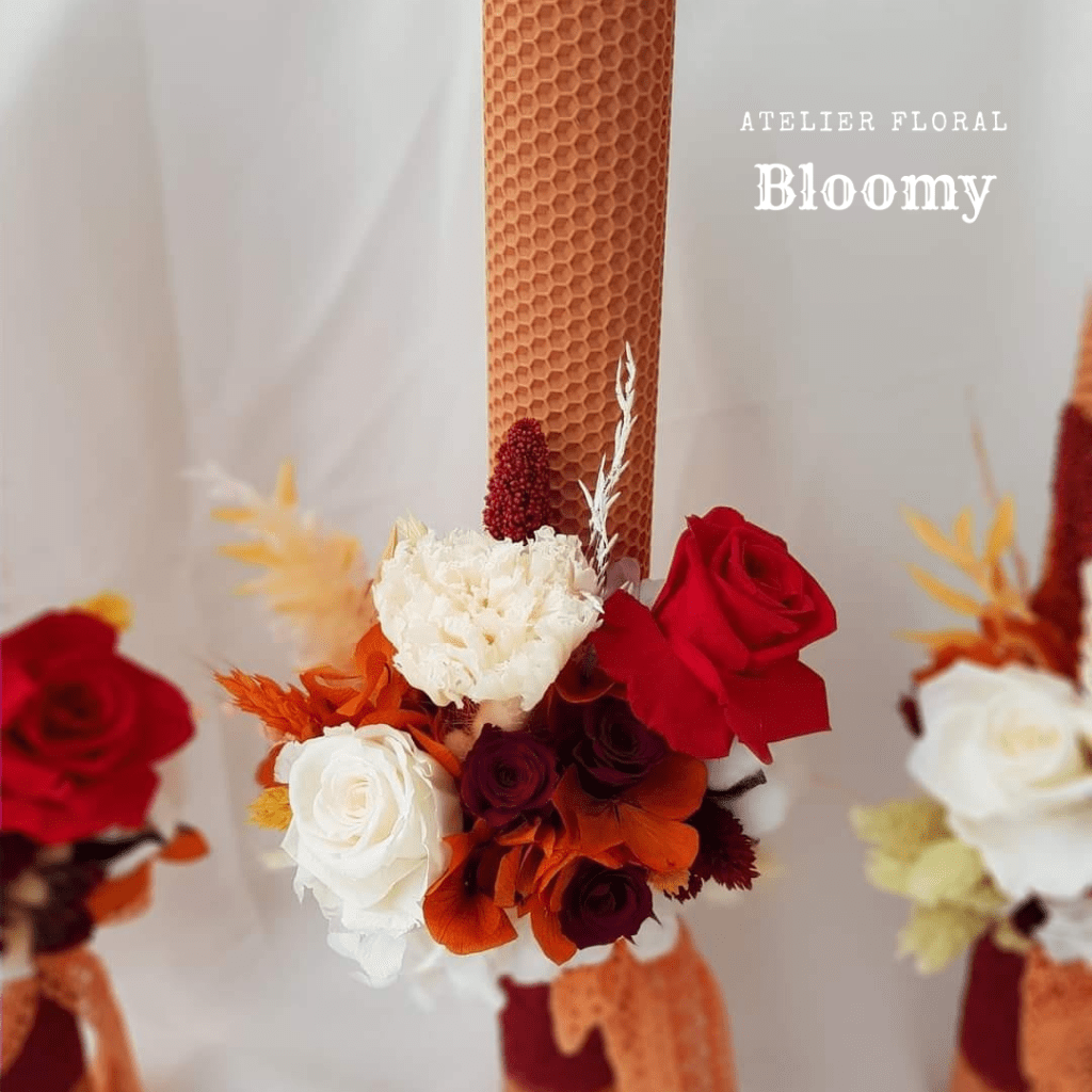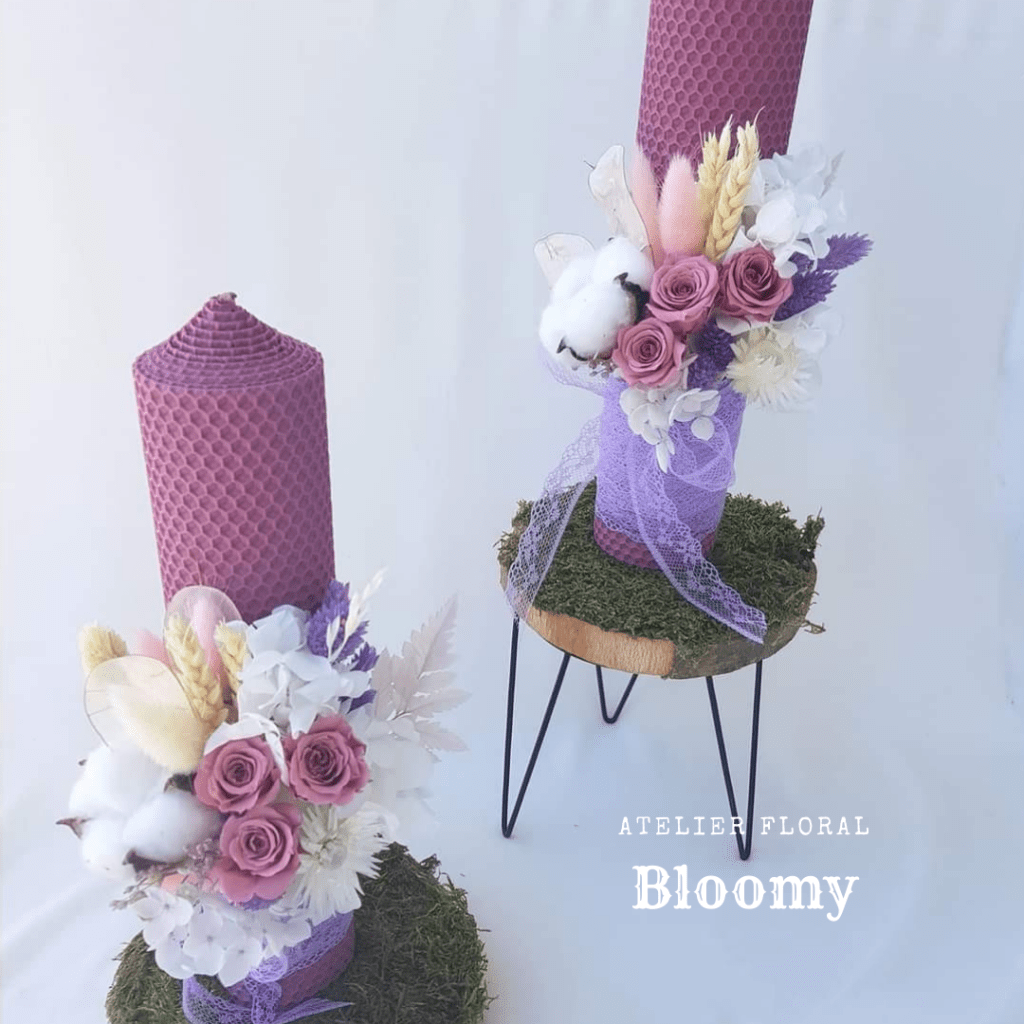 Lumânări cerate 50 cm, minirose lila mov, trandafiri albi somon, bumbac și flori stabilizate. Culoarea și decorațiunile cocardelor pot diferi.