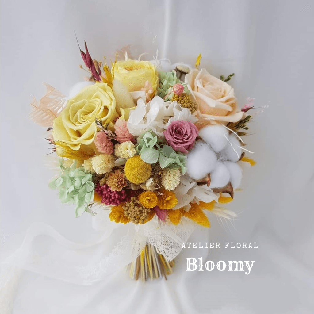 Trandafiri criogenati yellow, minirose yellow, hortensie verde mint, bumbac, flori stabilizate.